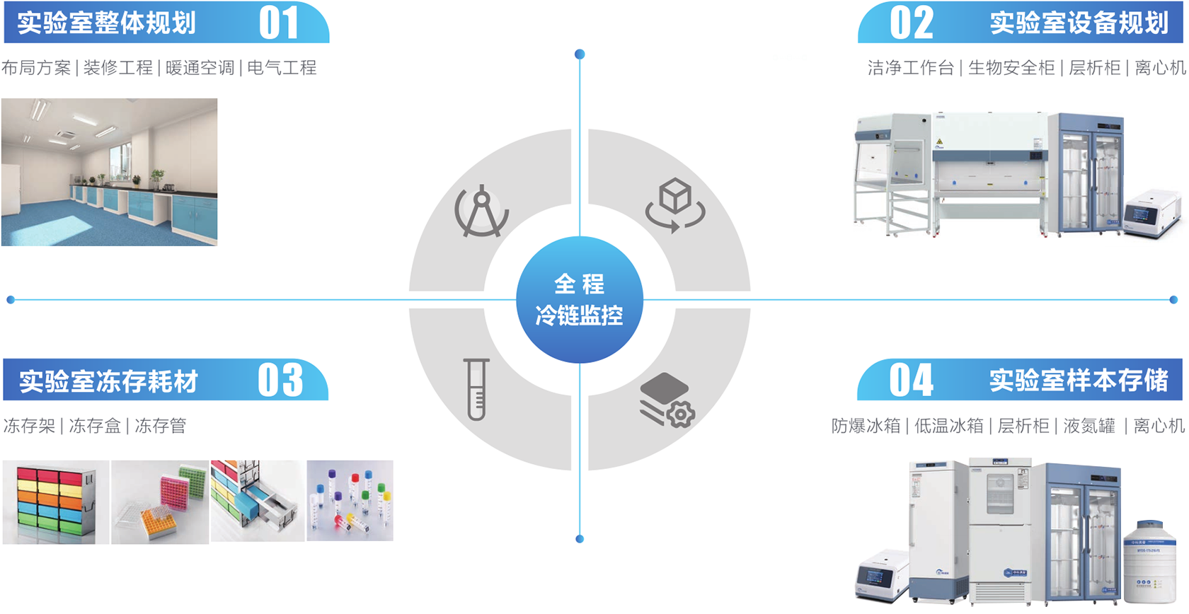 “云研安”中心實驗室解決方案利用全新的實驗室設計理念,配備專業的實驗室設備,完善的凍存耗材,全流程的冷鏈監控,確保實驗室安全存儲而打造一站式解決方案。